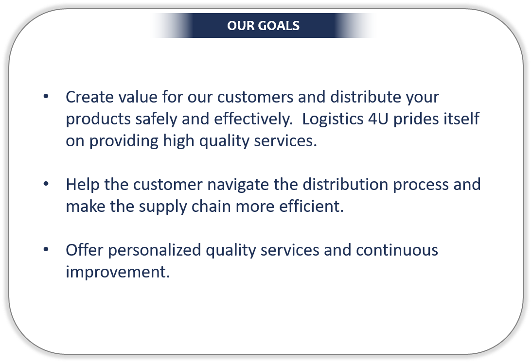 "At the core of everything we do are our customers". "We work 24/7/365 with quality (dedication) to become your prefered 3PL strategic partner, leading you to be competitive in your market. We have the knowledge, expertise, and at the same time